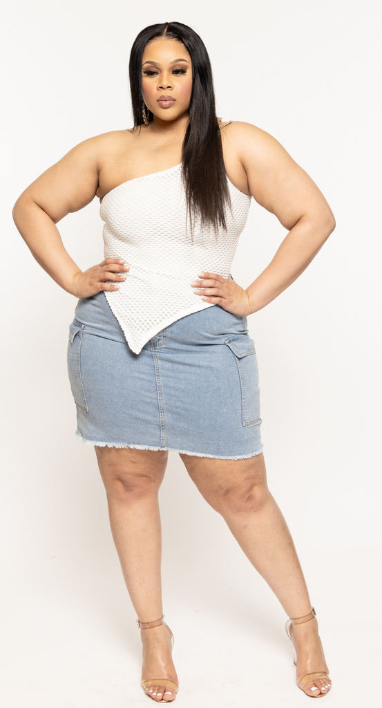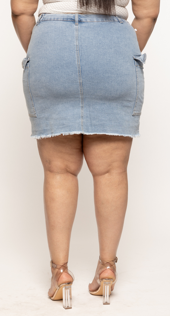 Level up your wardrobe with our must-have Complex Mini Skirt! A curvy blue jean design, this skirt is a game-changer for any outfit.
