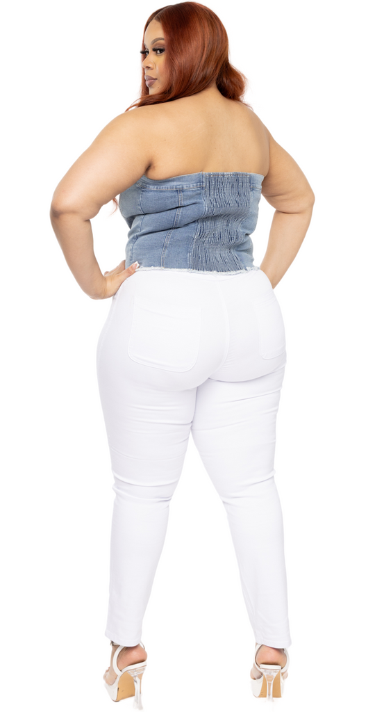 Rock this denim tube top for a sassy, carefree look. Perfect for summertime vibes and endless styling options, this top is a must-have for your wardrobe. Add a touch of edginess to any outfit and turn heads with this versatile piece. (Fashionably rebellious and effortlessly stylish!)